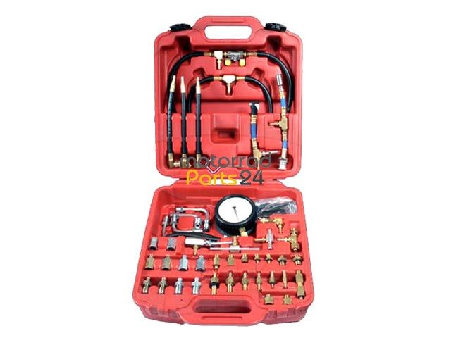 Kraftstoffdruck-Prüfgerät für Motoren mit Benzin-Einspritzanlagen mit Manometer mit Anschluss-Schlauch-Sortiment mit umfangreichem Adapter-Sortiment für . Kraftstoffdruck-Prüfgerät für alle Einspritzmotoren, 70-tlg. Ideal für mechanische und elektronische Benzin-Einspritzanlagen. Benzin Druck Messer Tester Kraftstoffdruck Prüfgerät messen prüfen Kfz. Benzin Druck Prüfer Tester Benzin Druckprüfung Kraftstoff Druckprüfer Prüfgerät.